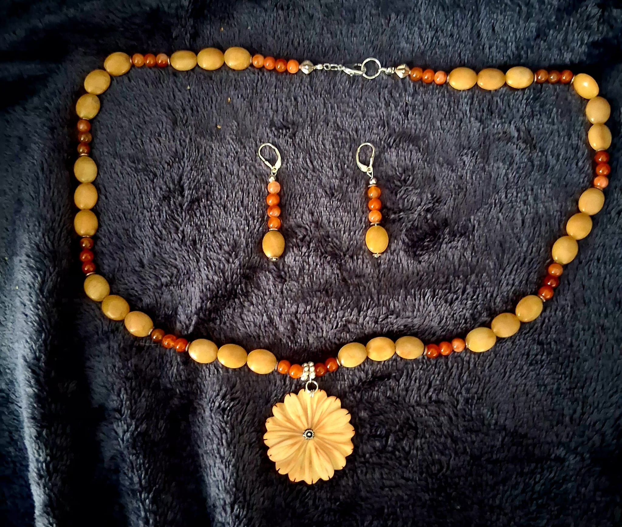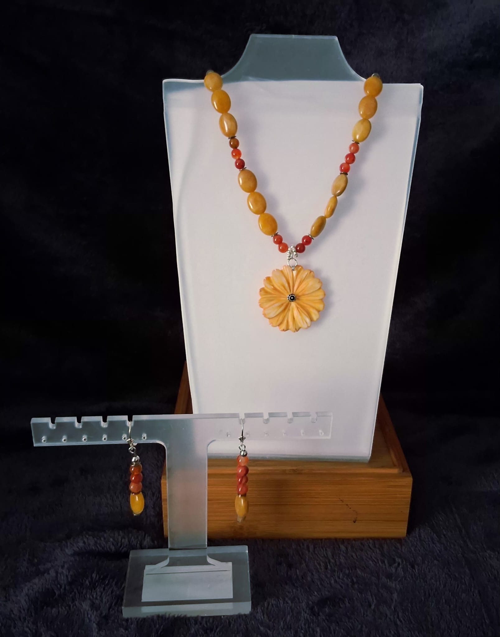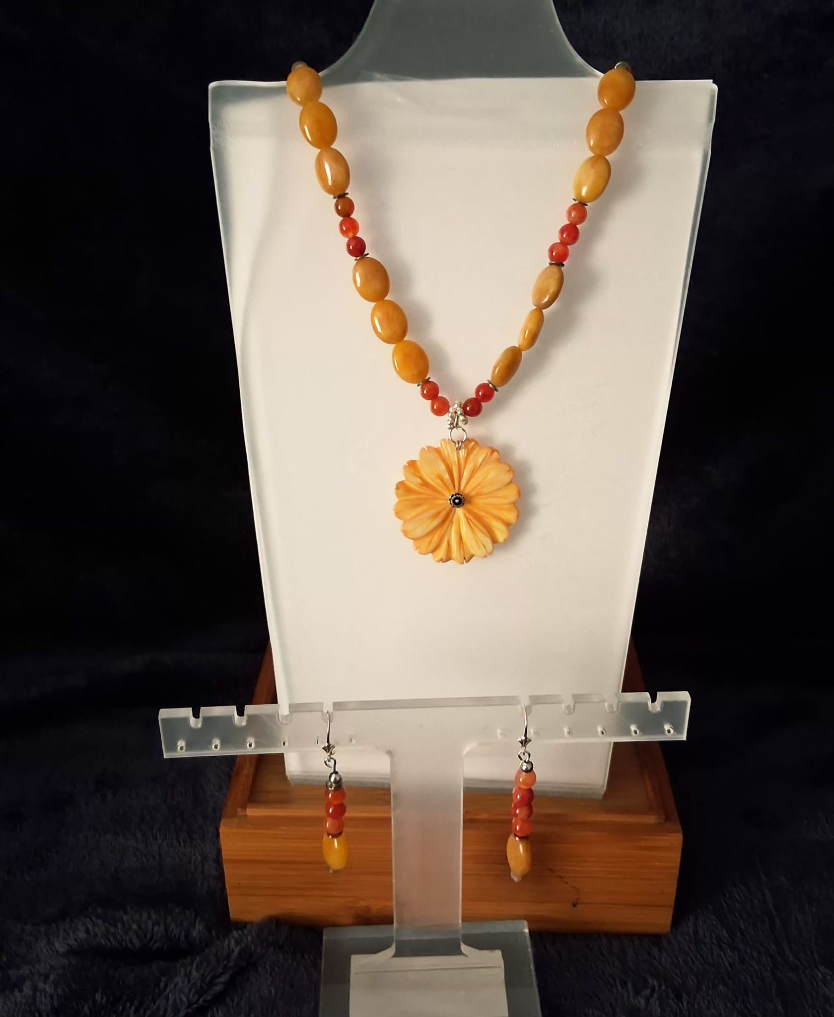 Stand out with this beautiful handmade jewelry set crafted with genuine aventurine stone. This elegant necklace and matching earrings set features warm, natural tones and a stunning floral pendant that adds a refined, artistic touch to any outfit.