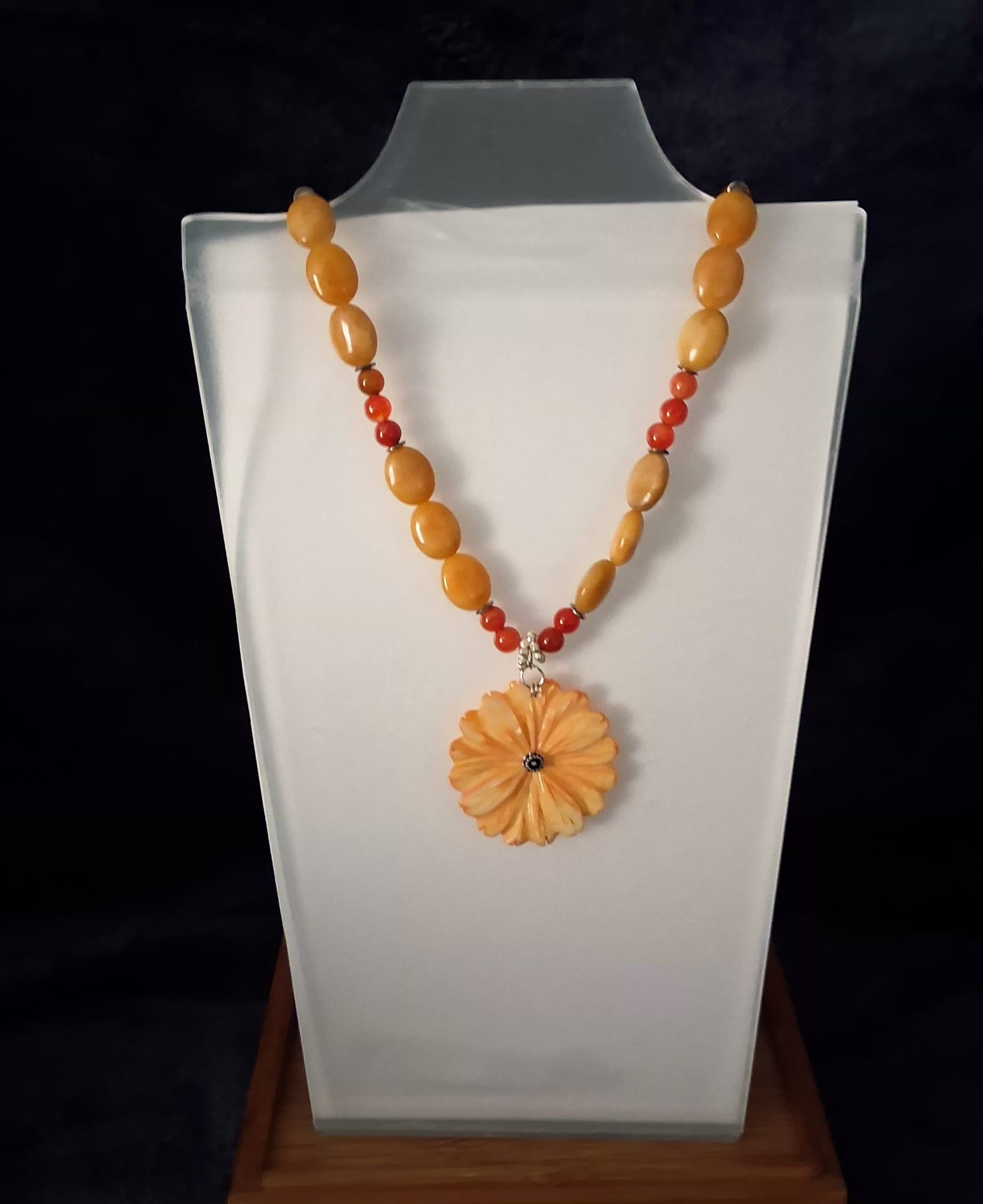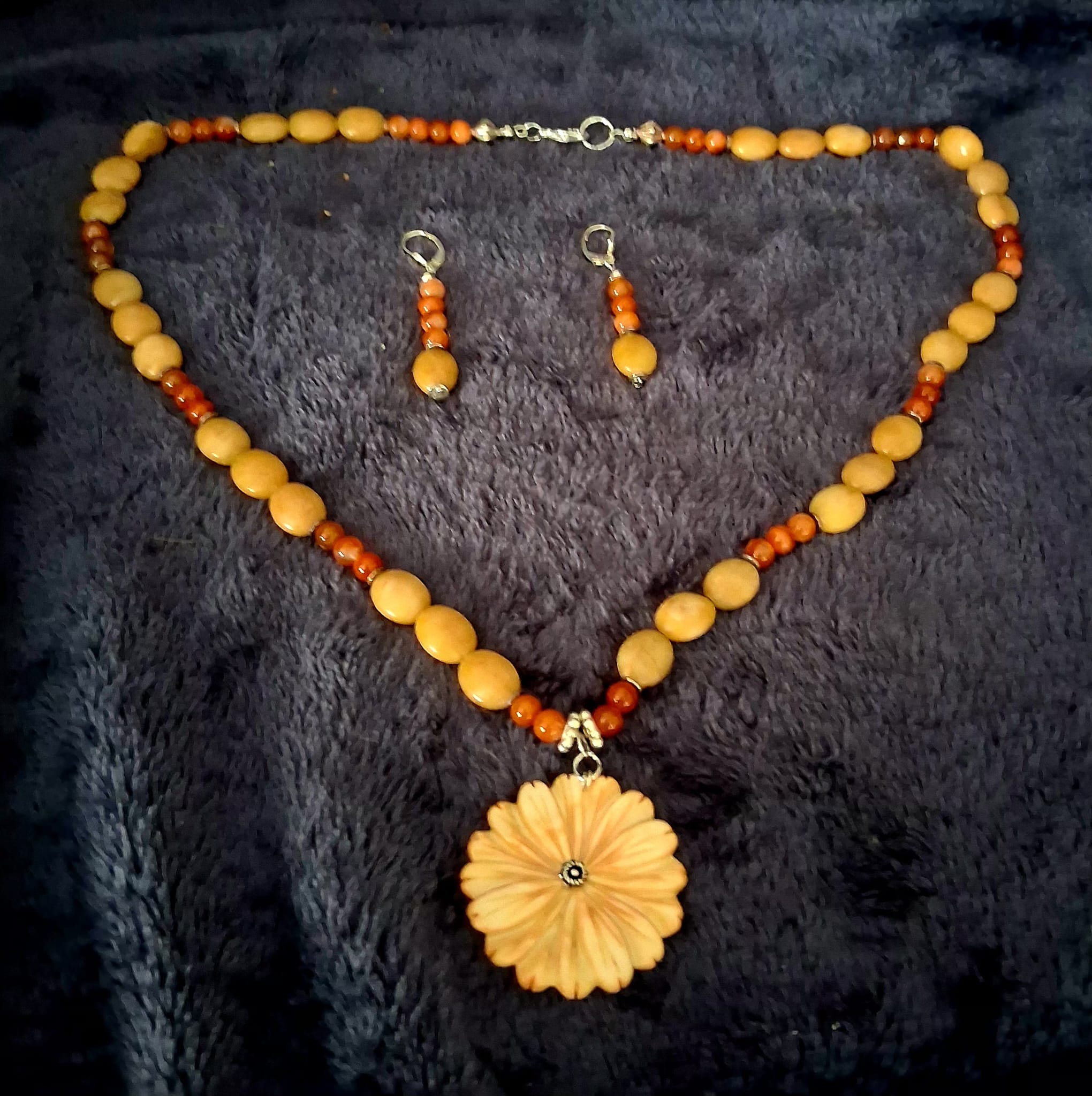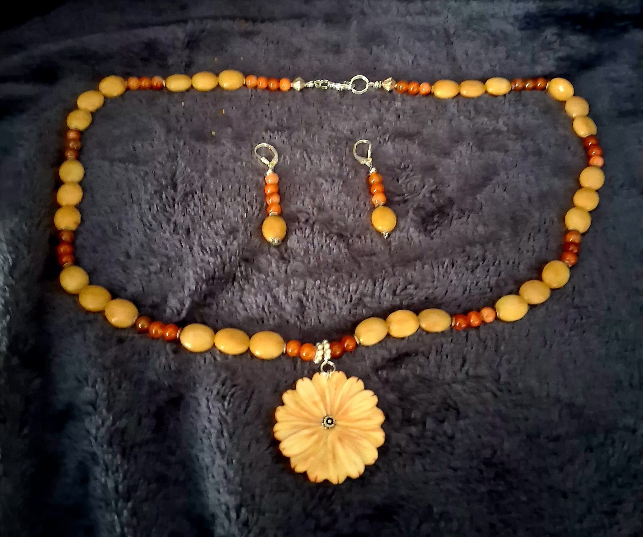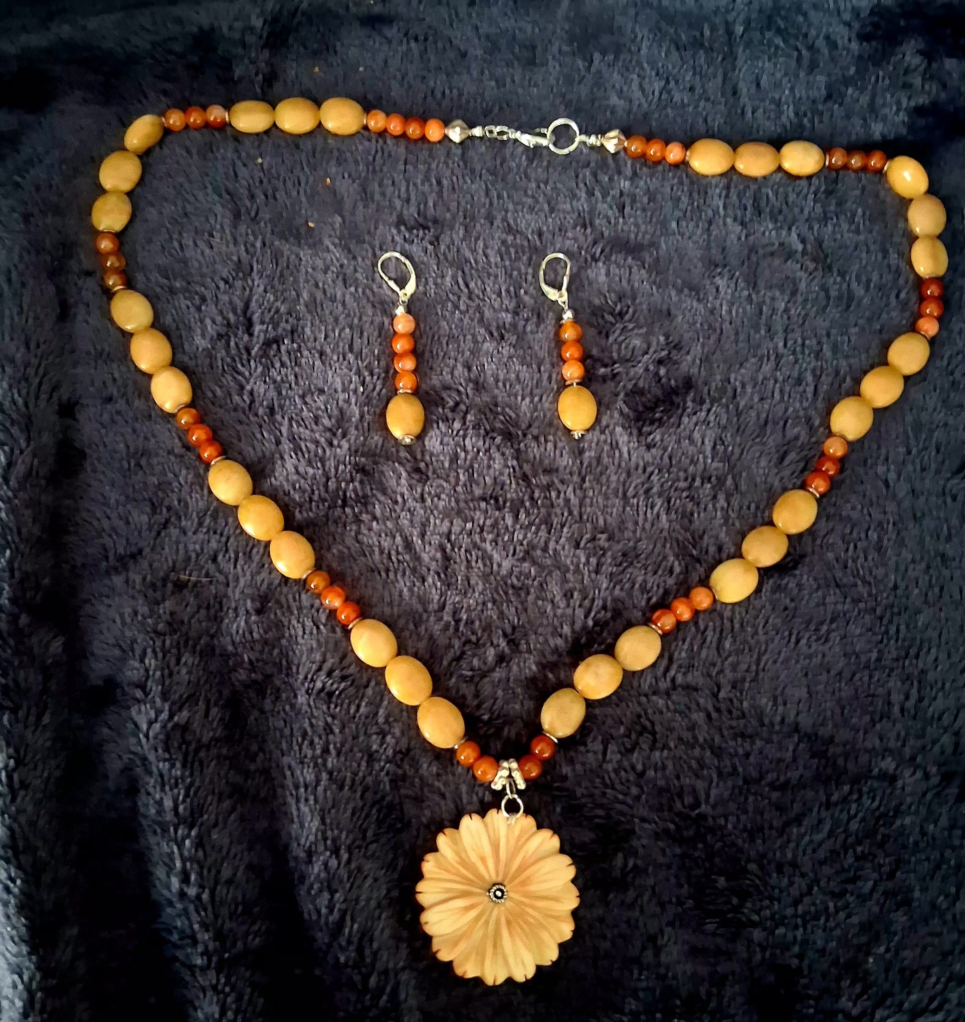 Stand out with this beautiful handmade jewelry set crafted with genuine aventurine stone. This elegant necklace and matching earrings set features warm, natural tones and a stunning floral pendant that adds a refined, artistic touch to any outfit.