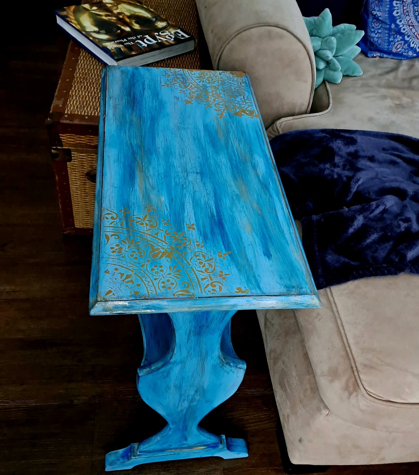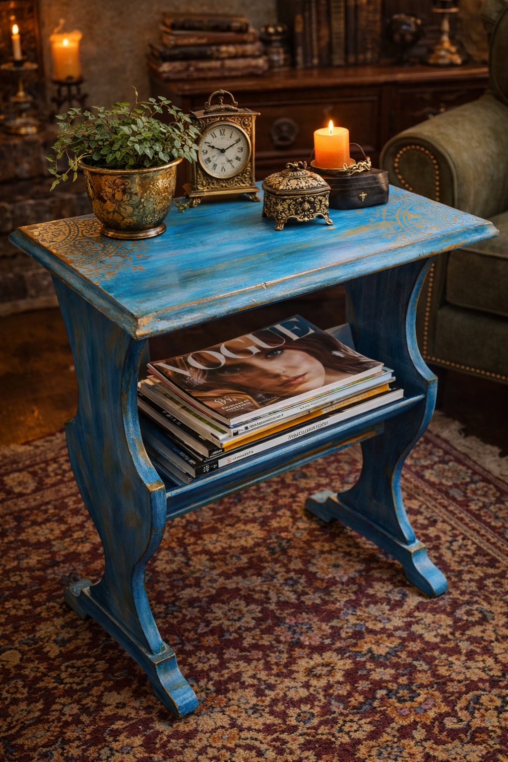 Hand-Painted Artisan Accent Table – Ocean Blue & Gold Filigree Design
