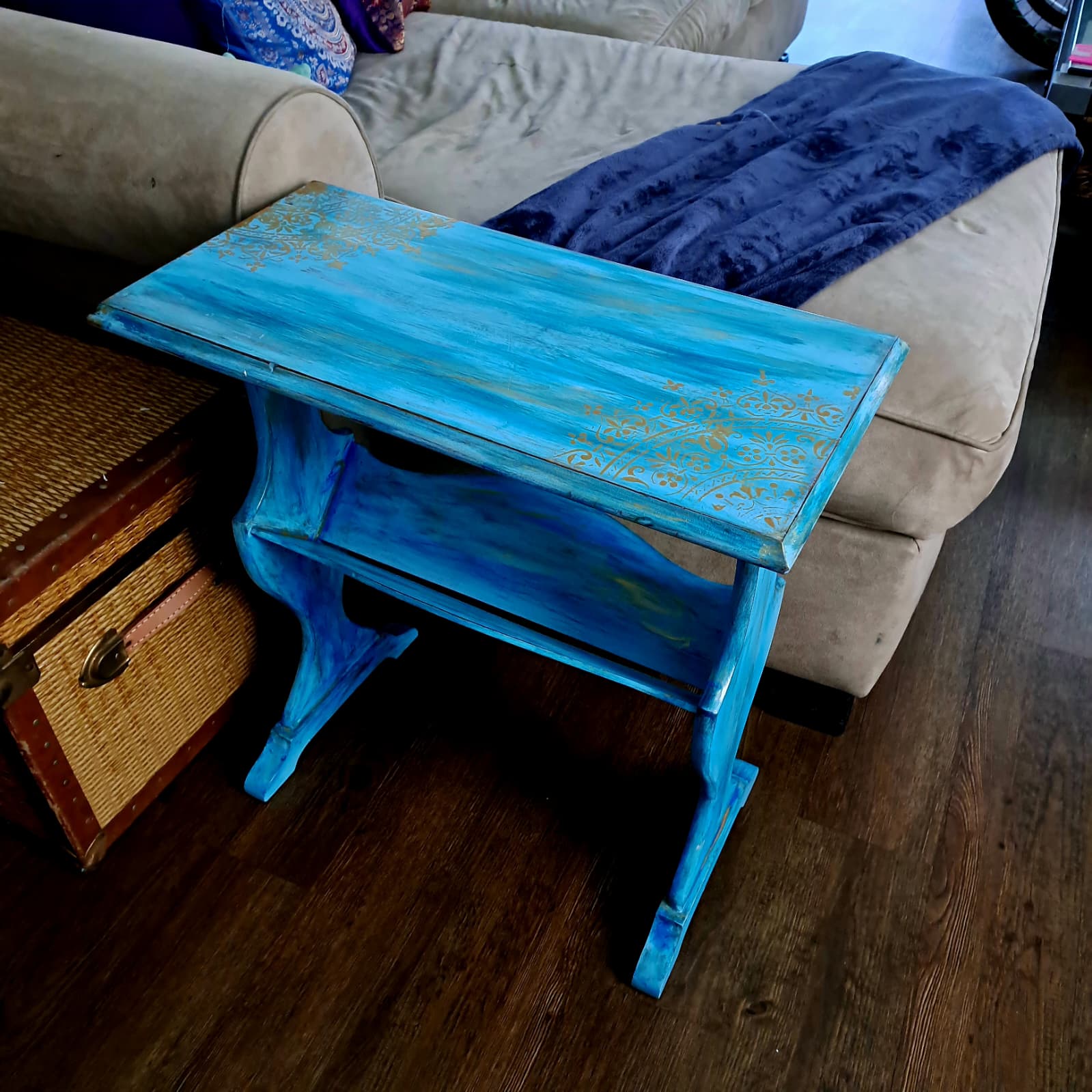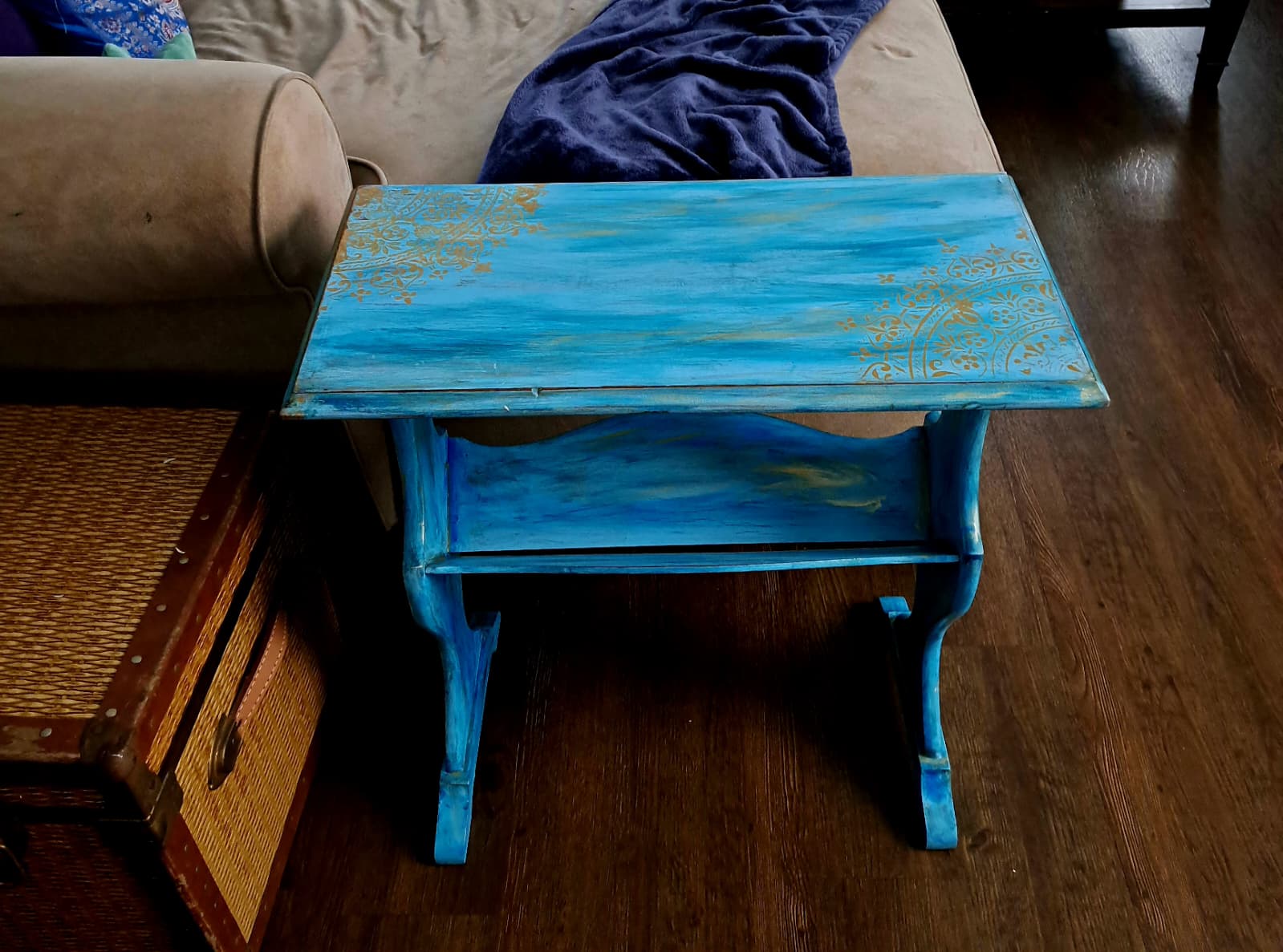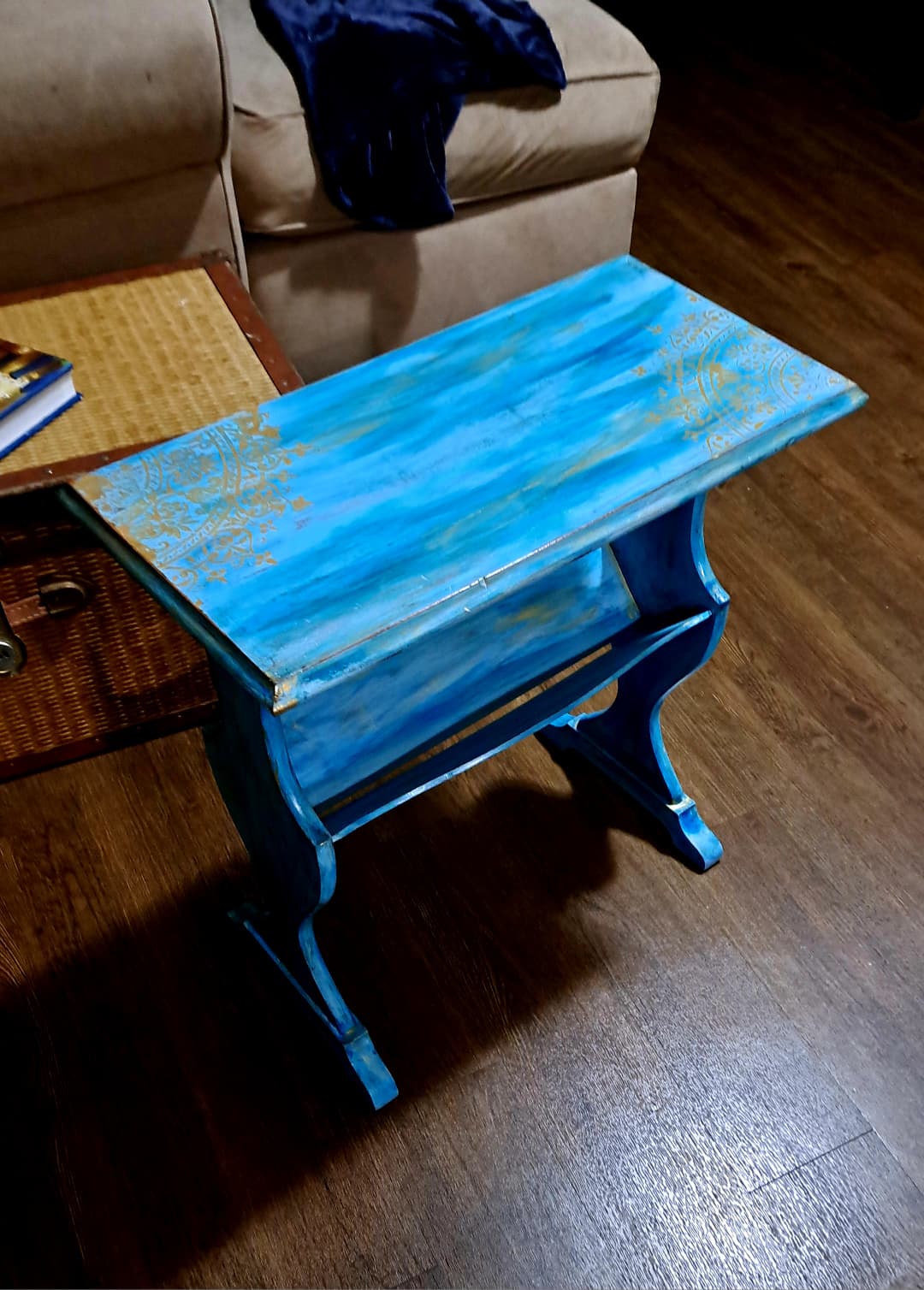 ✨ Hand-Painted Artisan Accent Table – Ocean Blue & Gold Filigree Design – Unique Decorative Furniture Piece by The Mystic Squirrel ✨
