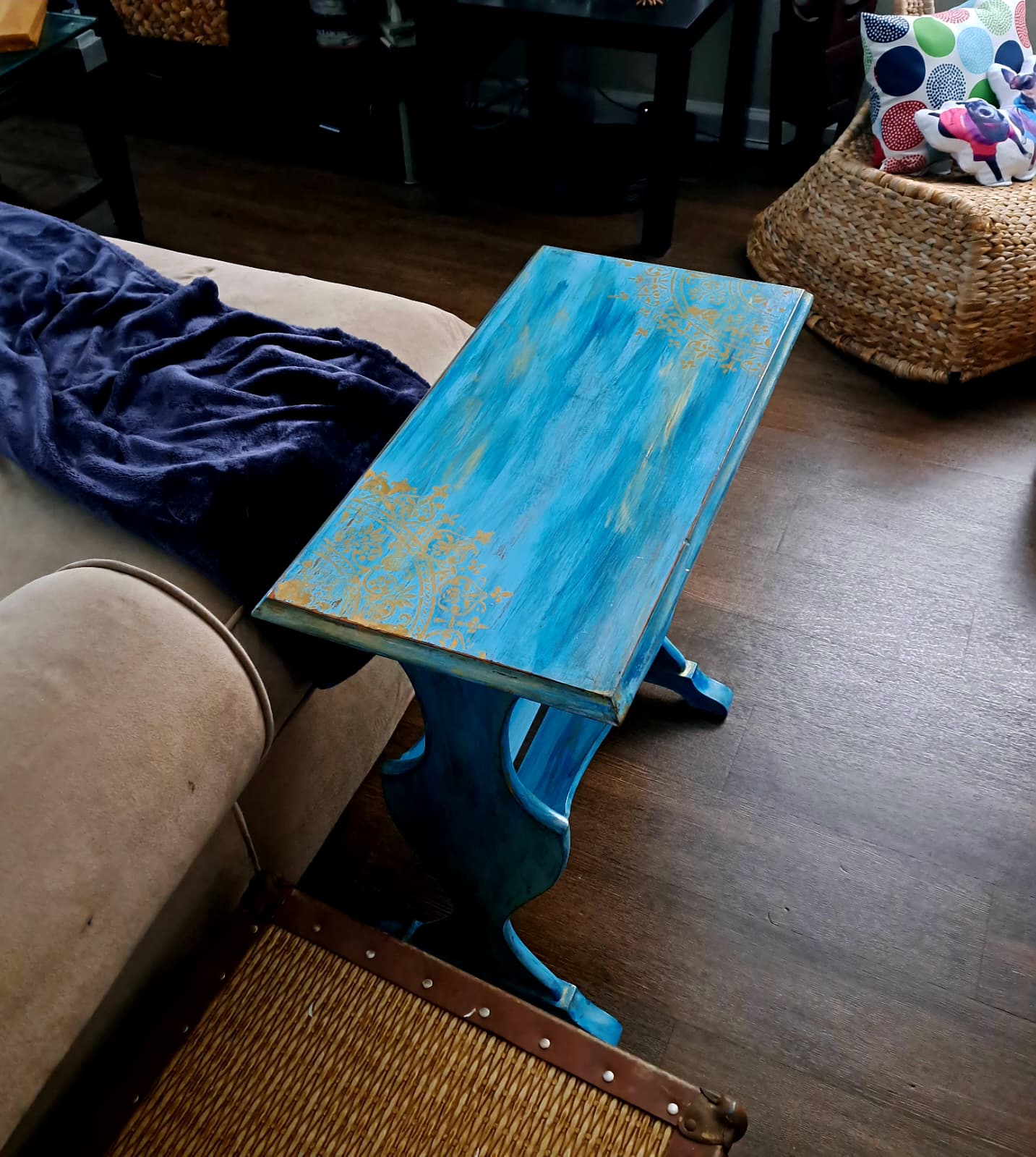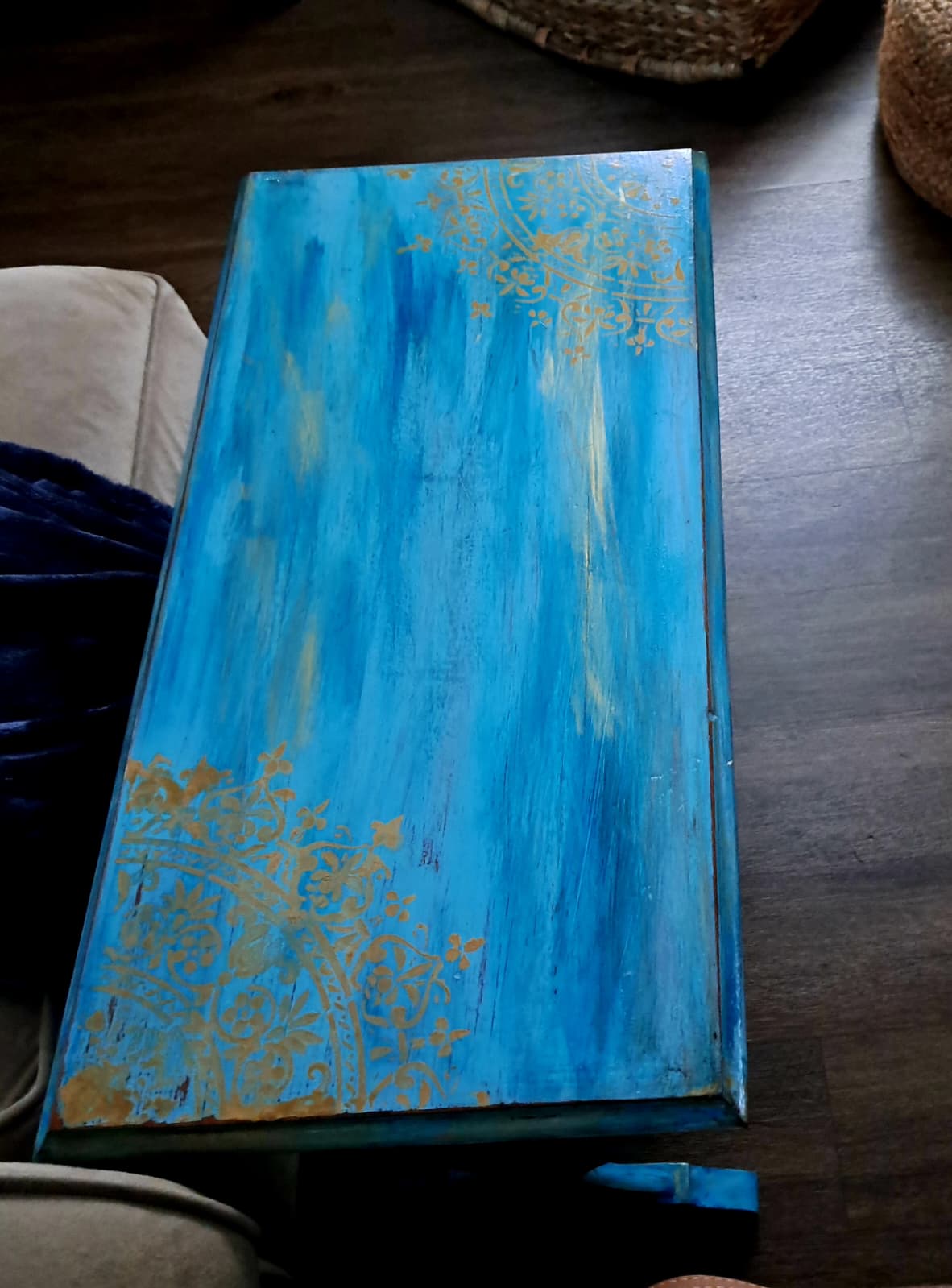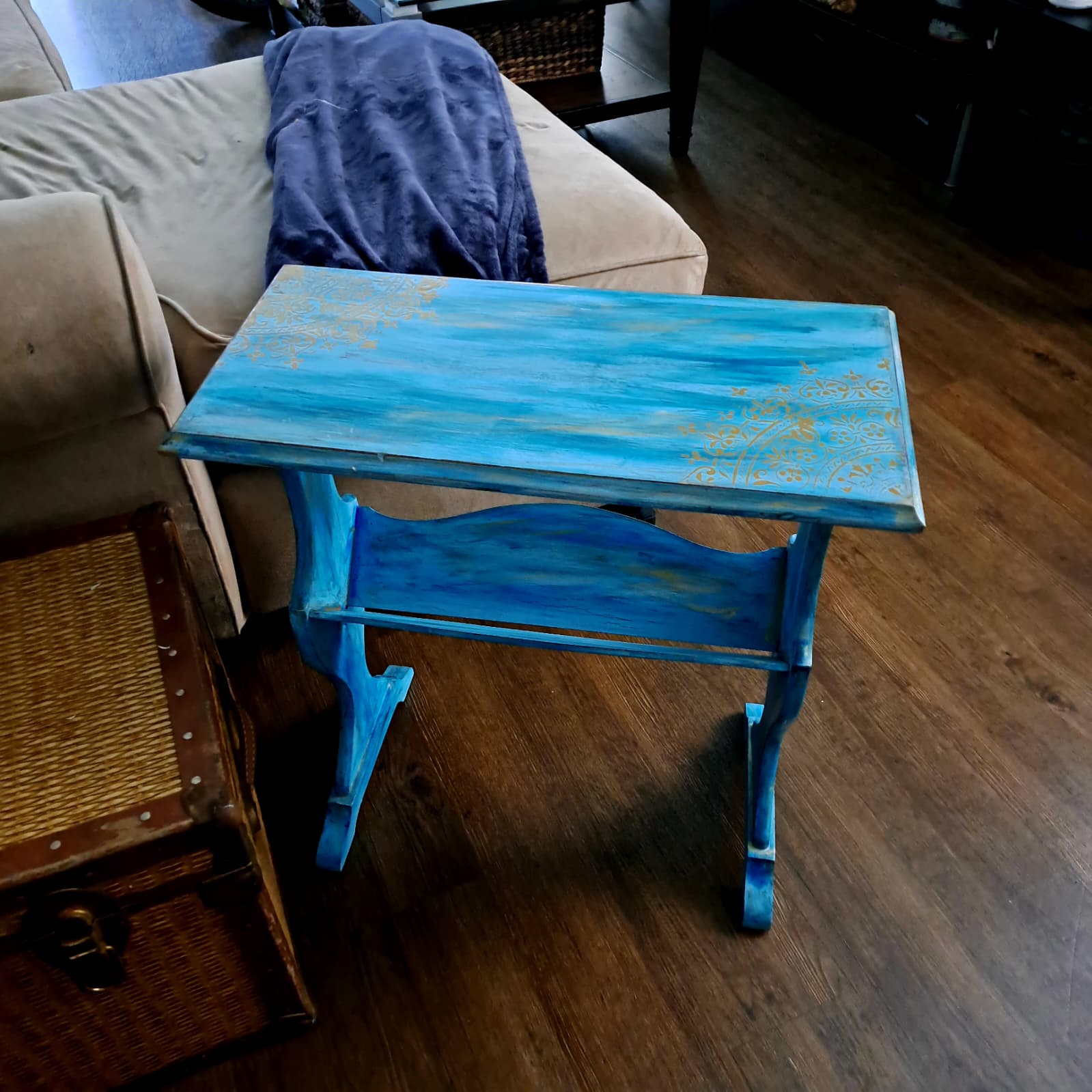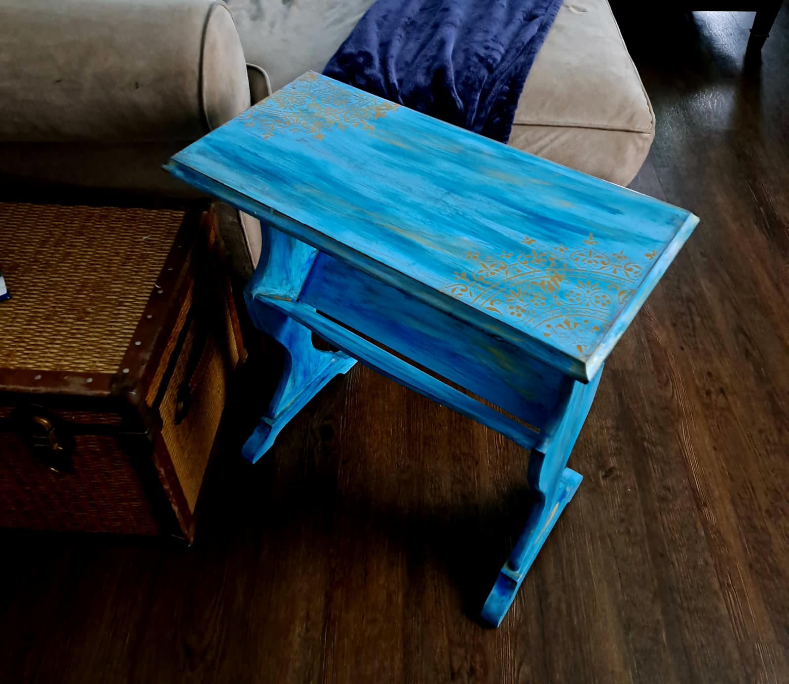 ✨ Hand-Painted Artisan Accent Table – Ocean Blue & Gold Filigree Design – Unique Decorative Furniture Piece by The Mystic Squirrel ✨