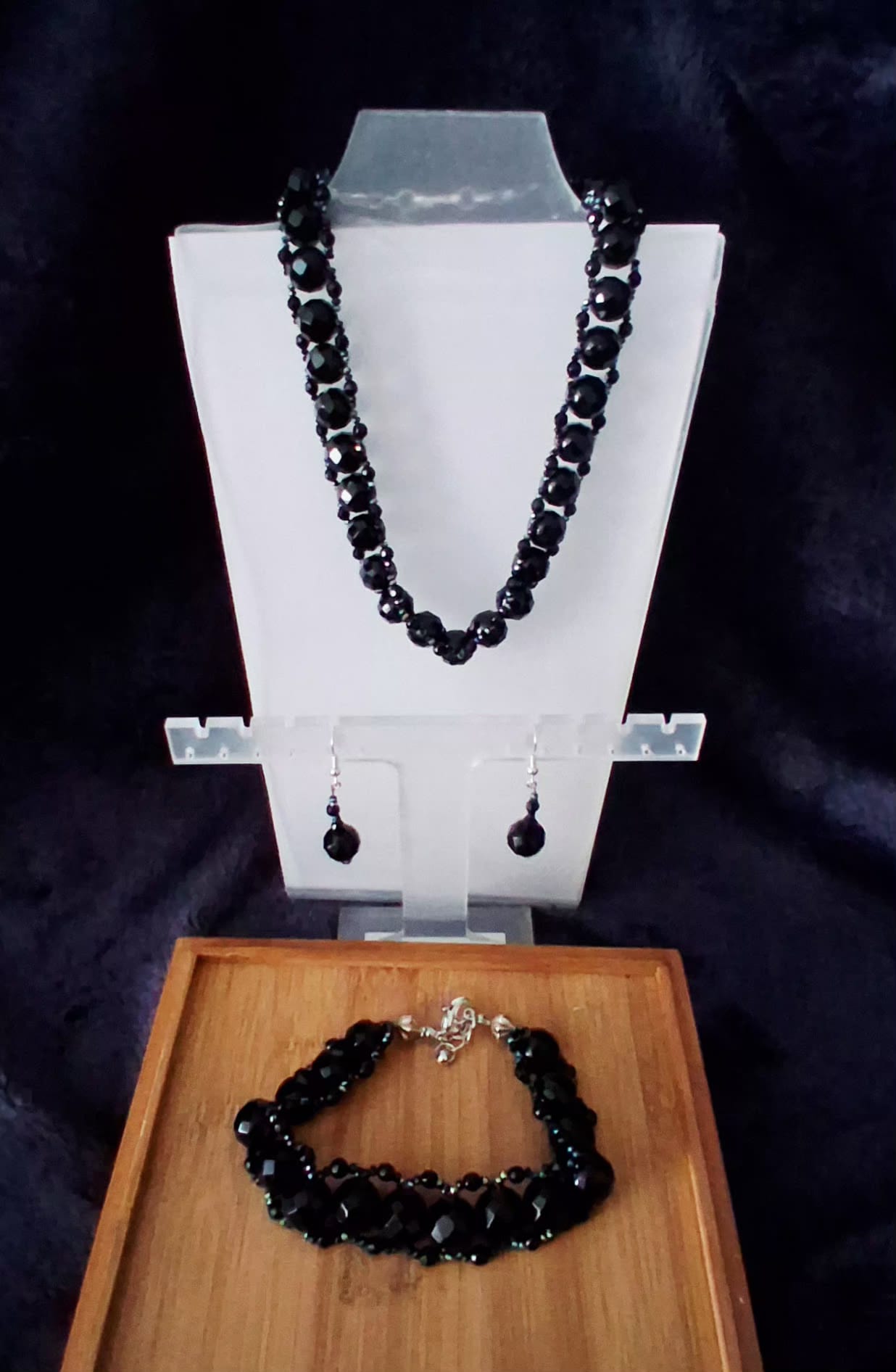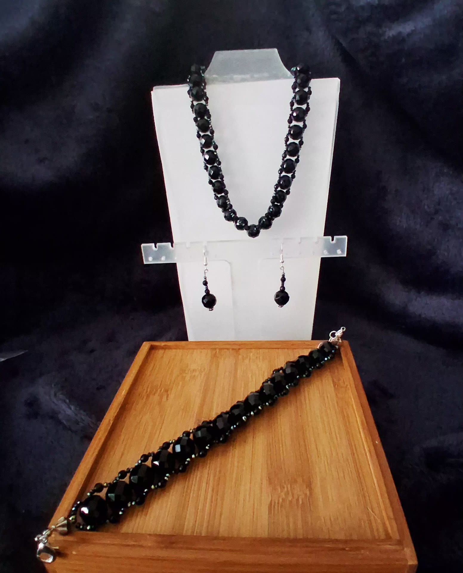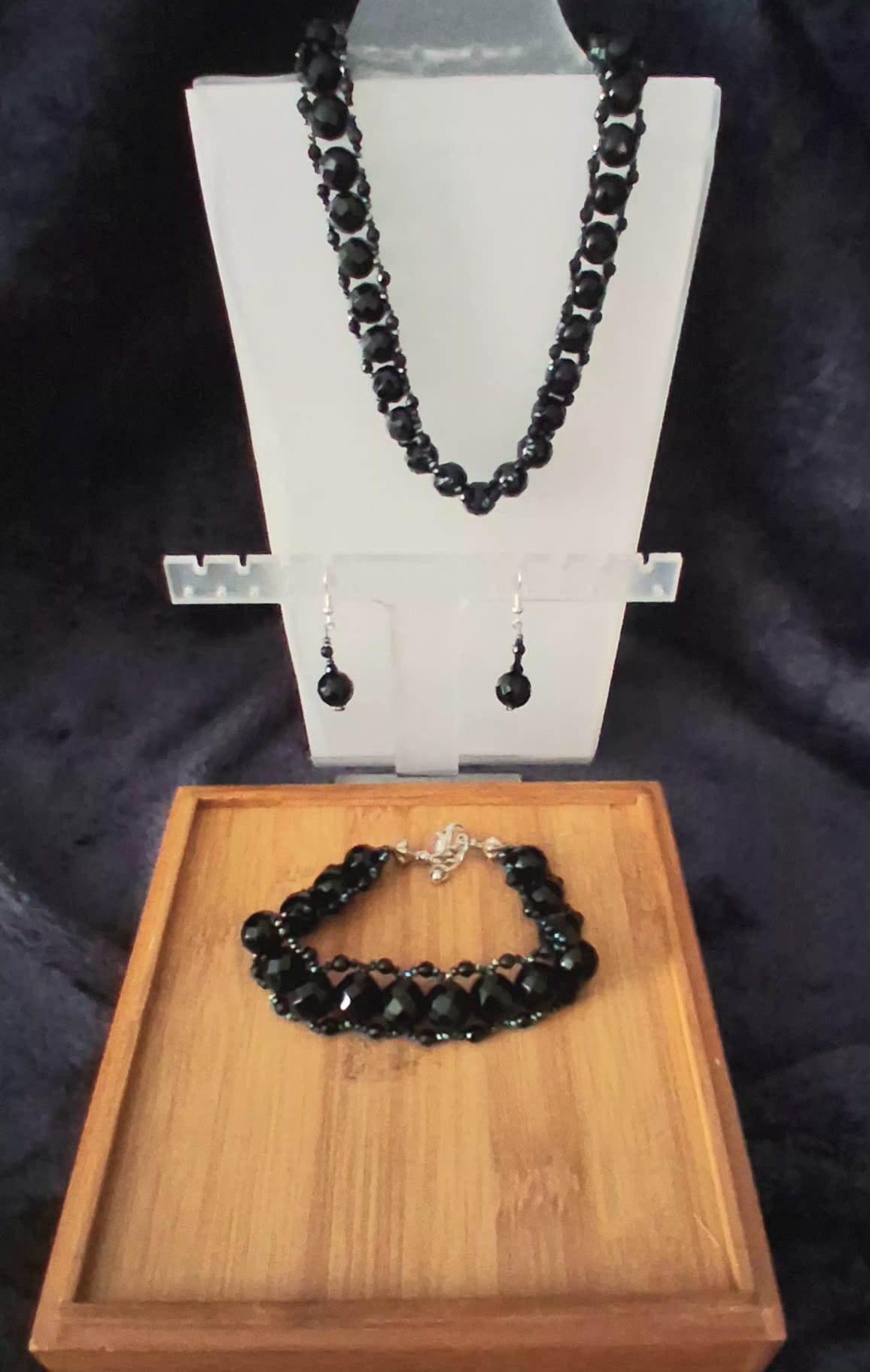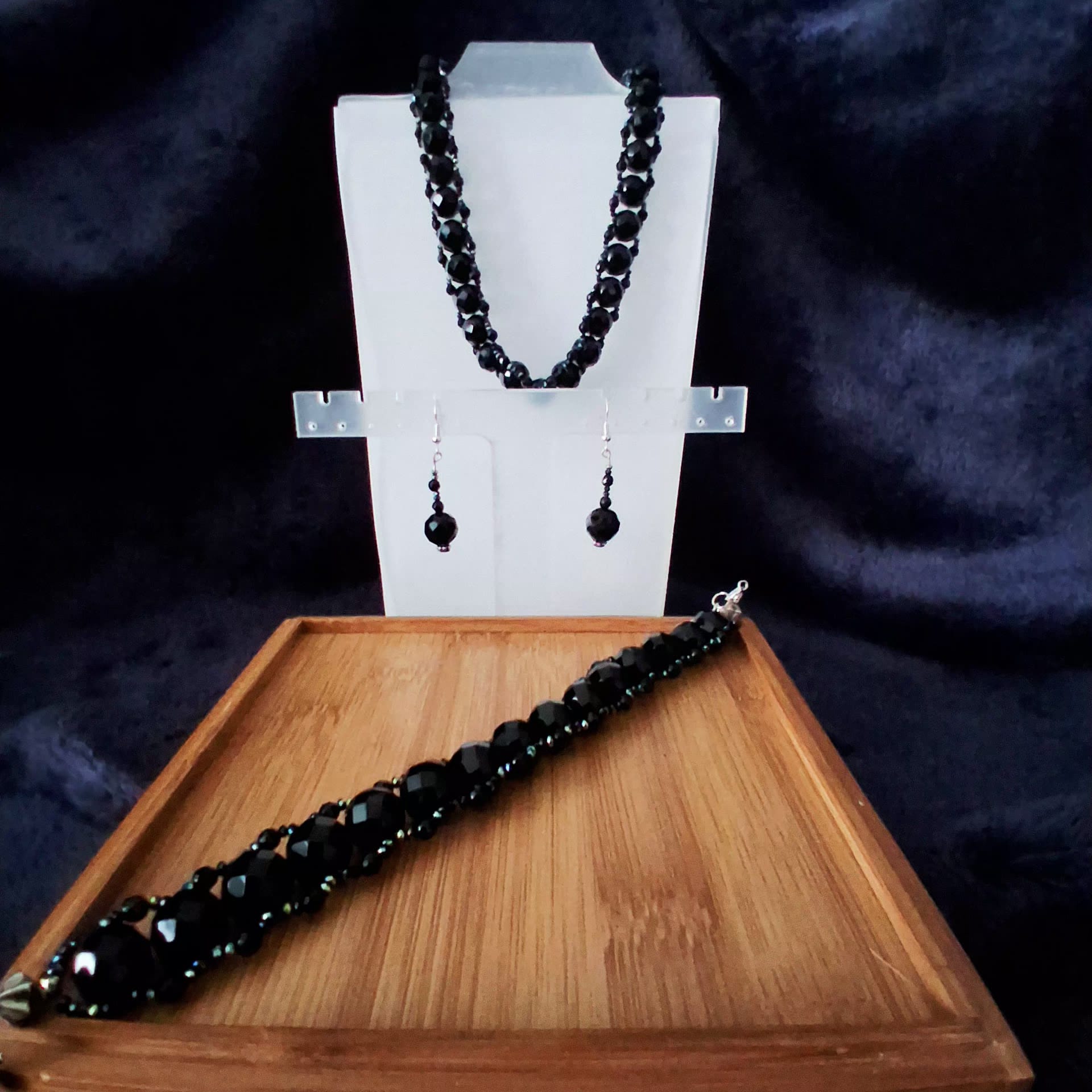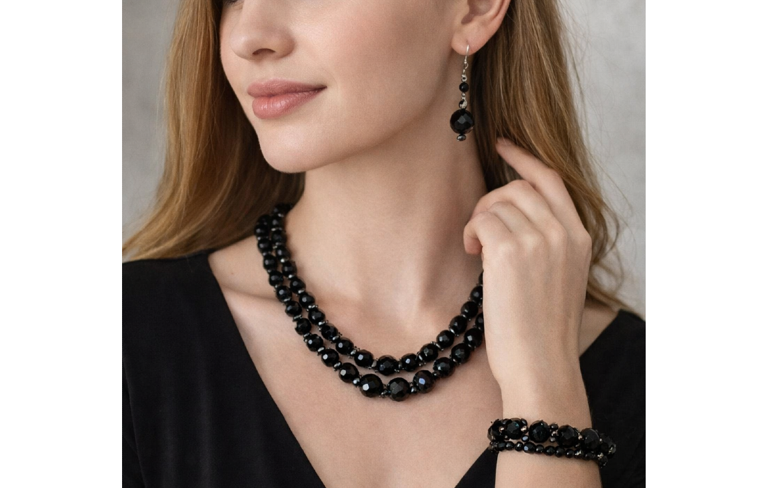 The necklace and bracelet feature faceted black onyx beads that reflect light subtly and elegantly. The dangle earrings perfectly complement the set, adding balance and a refined finish.