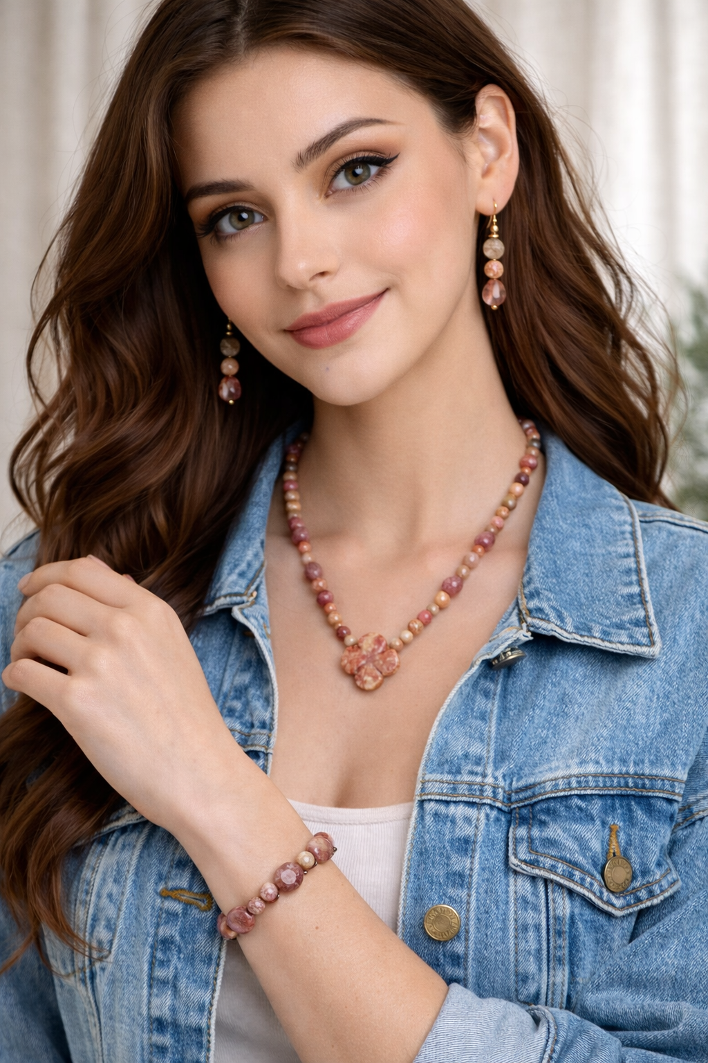 Elevate your style with this beautiful three-piece handmade jewelry set, crafted with genuine semi-precious Jasper stones and finished with elegant gold-tone accents. This coordinated set includes a necklace, bracelet, and matching earrings—perfect for everyday wear or special occasions.
