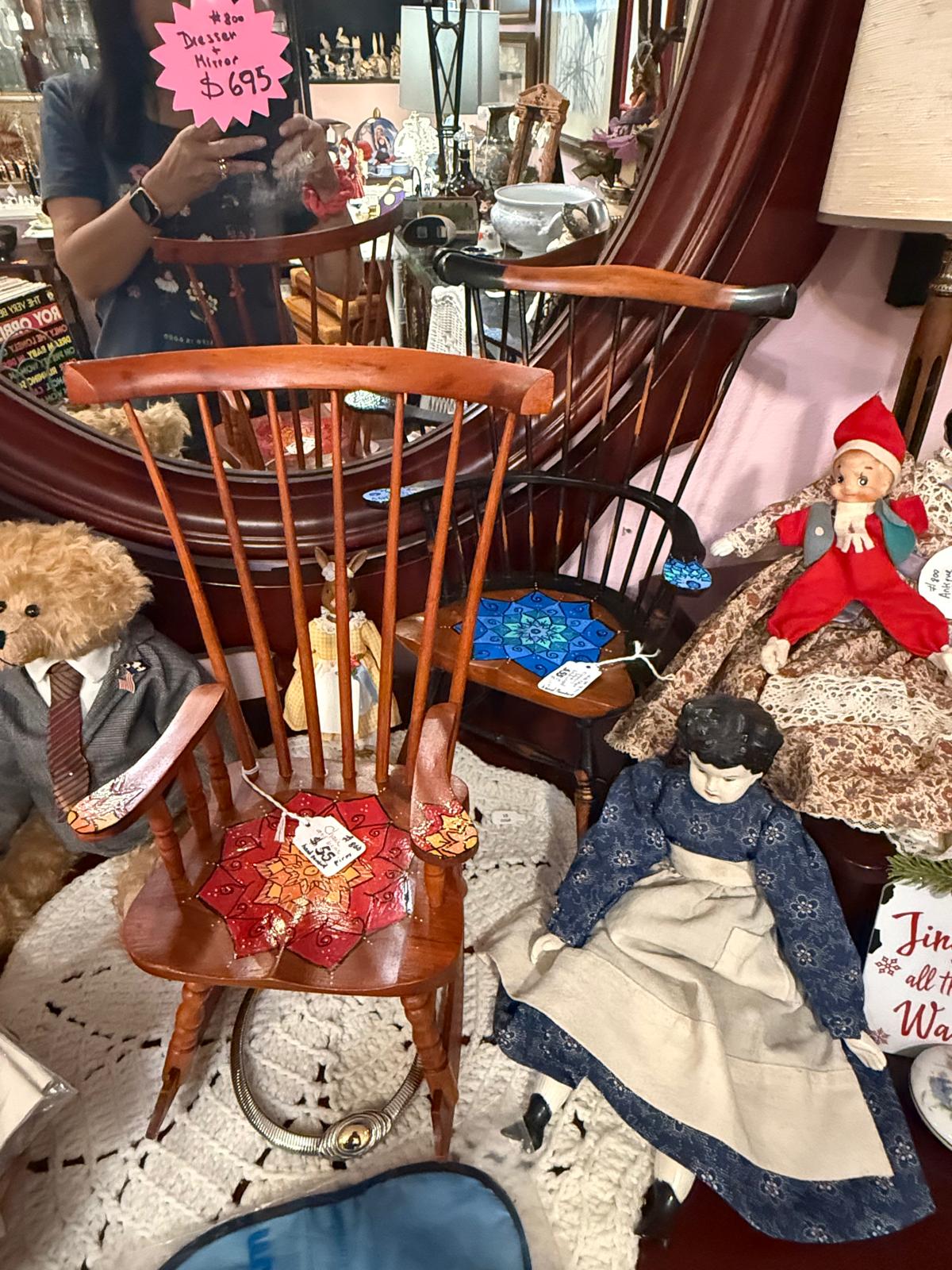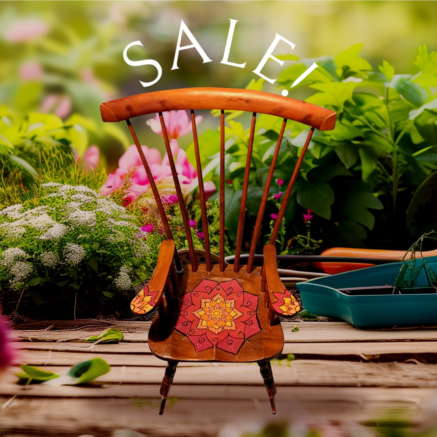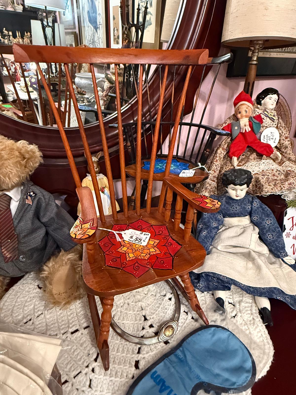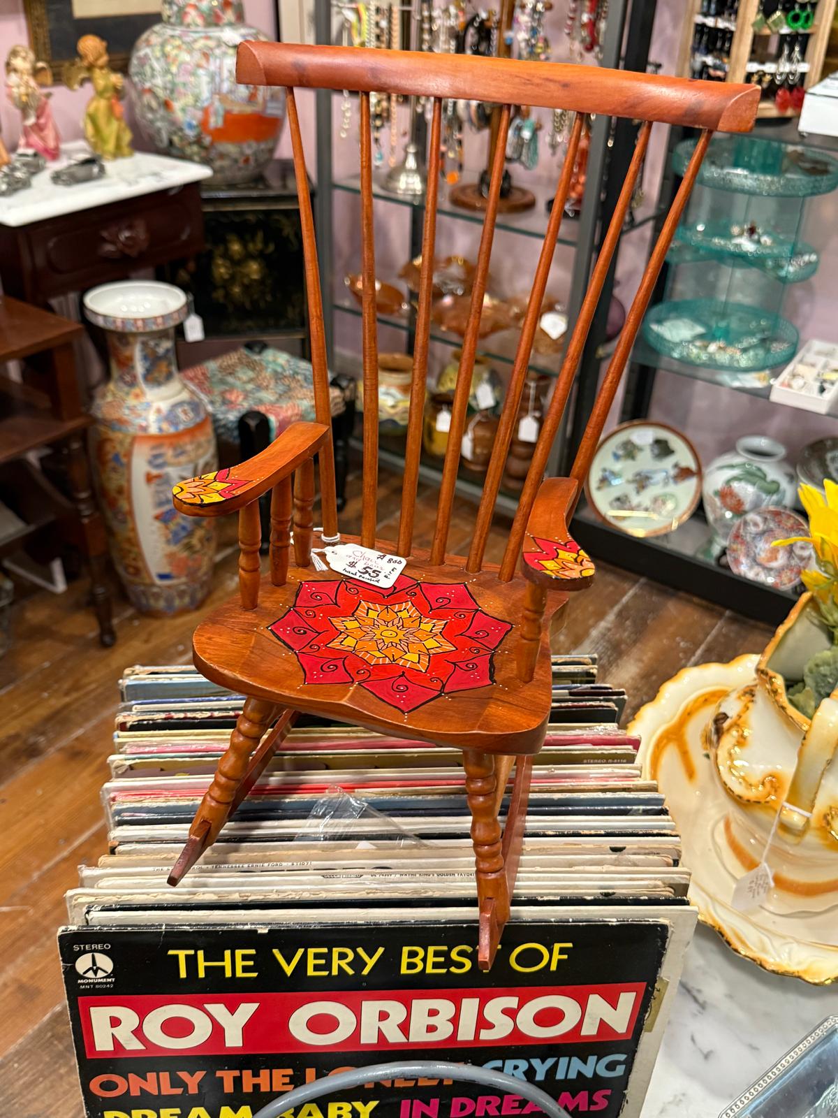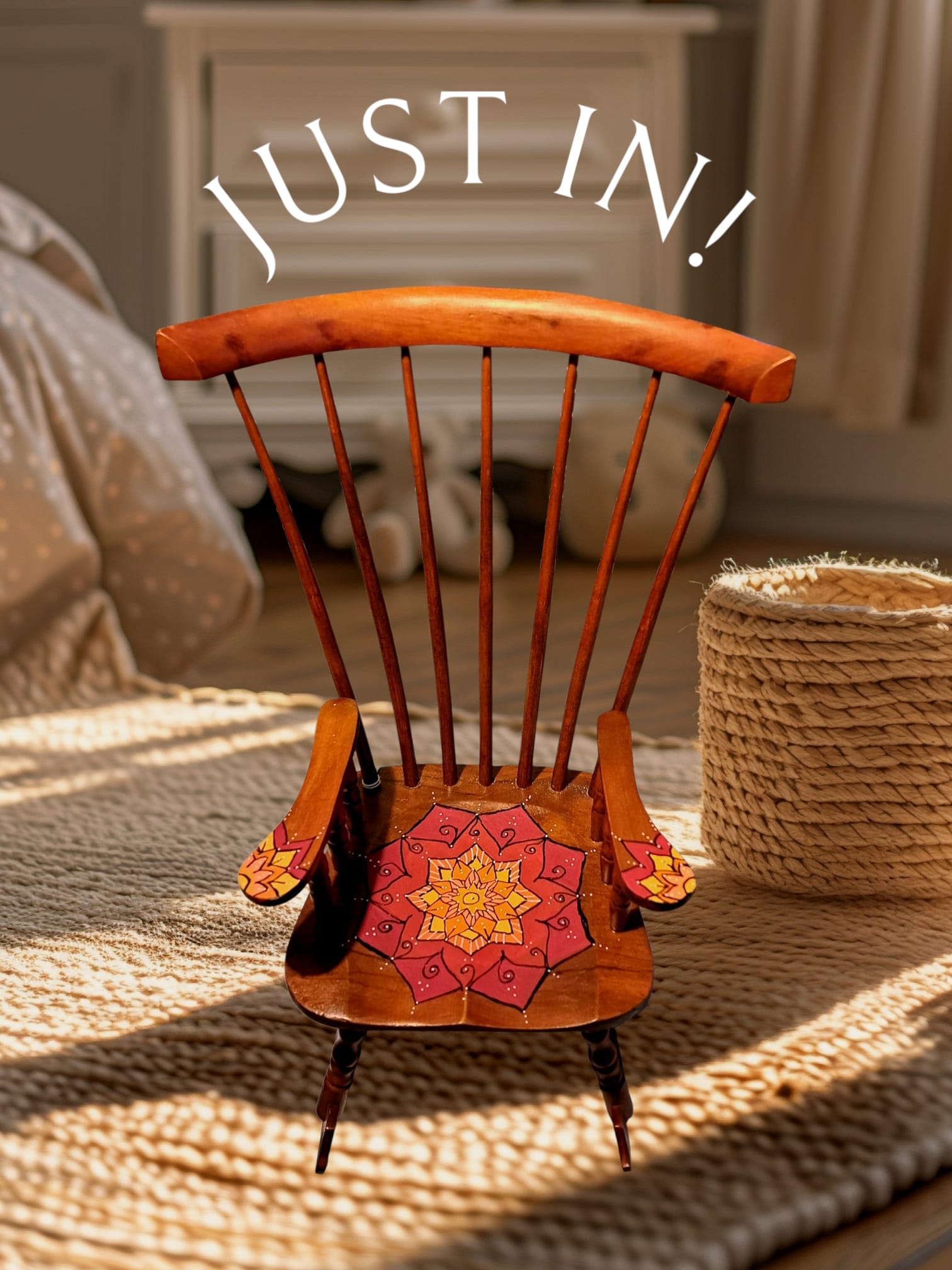 Turn any corner of your home into a celebration of color and craftsmanship with this charming vintage doll-size rocking chair. Each piece is lovingly hand-painted with a vibrant multicolor mandala, transforming a simple miniature rocker into a true work of art.