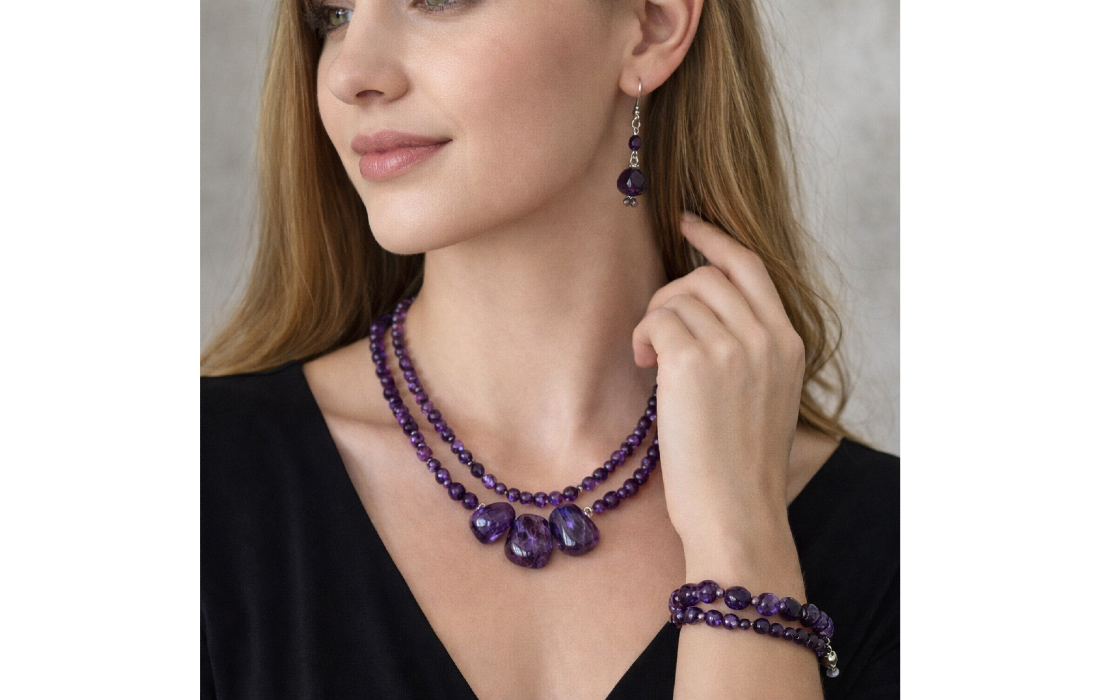 Natural Amethyst Jewelry Set – Double-Strand Necklace, Bracelet & Earrings
