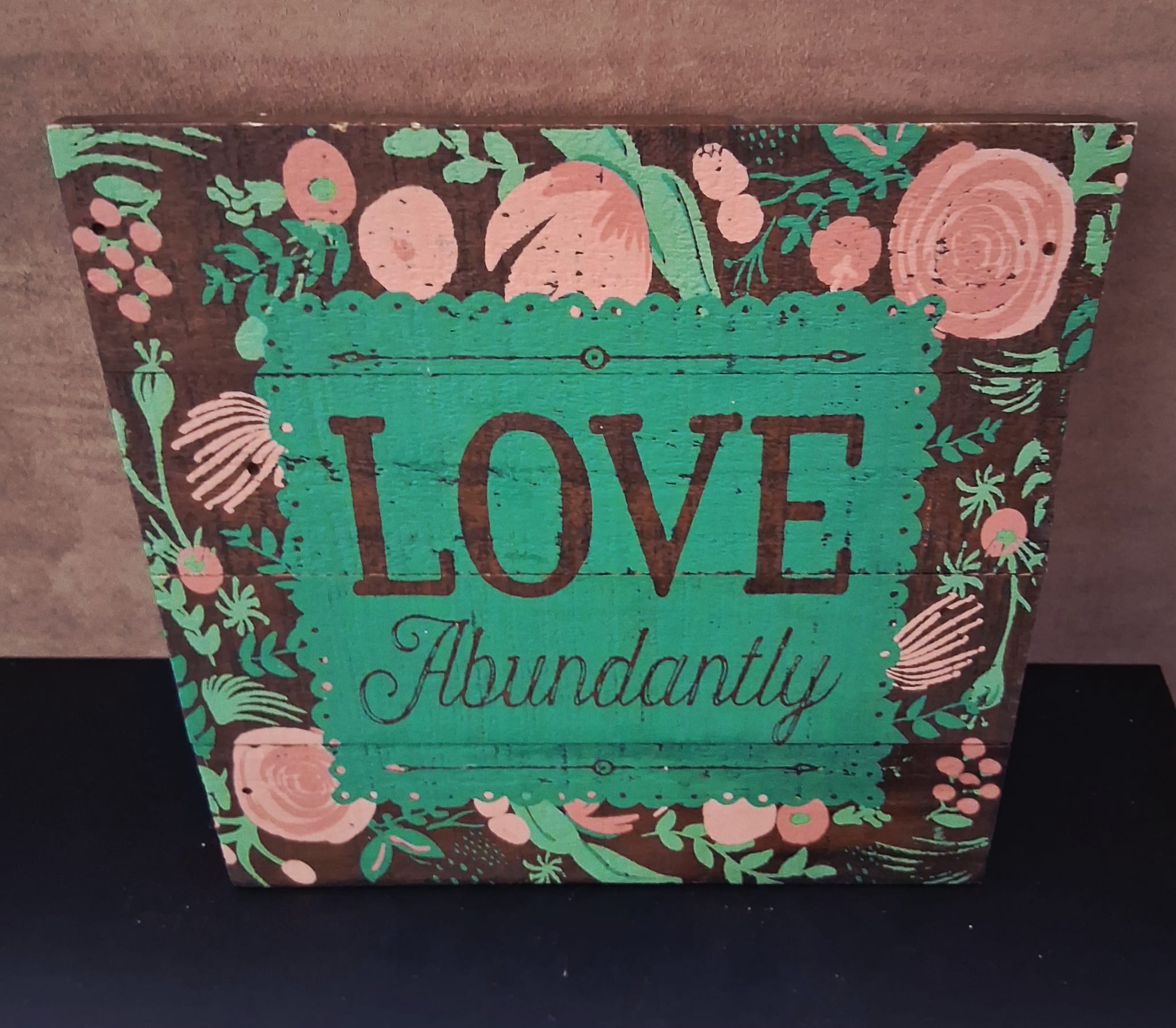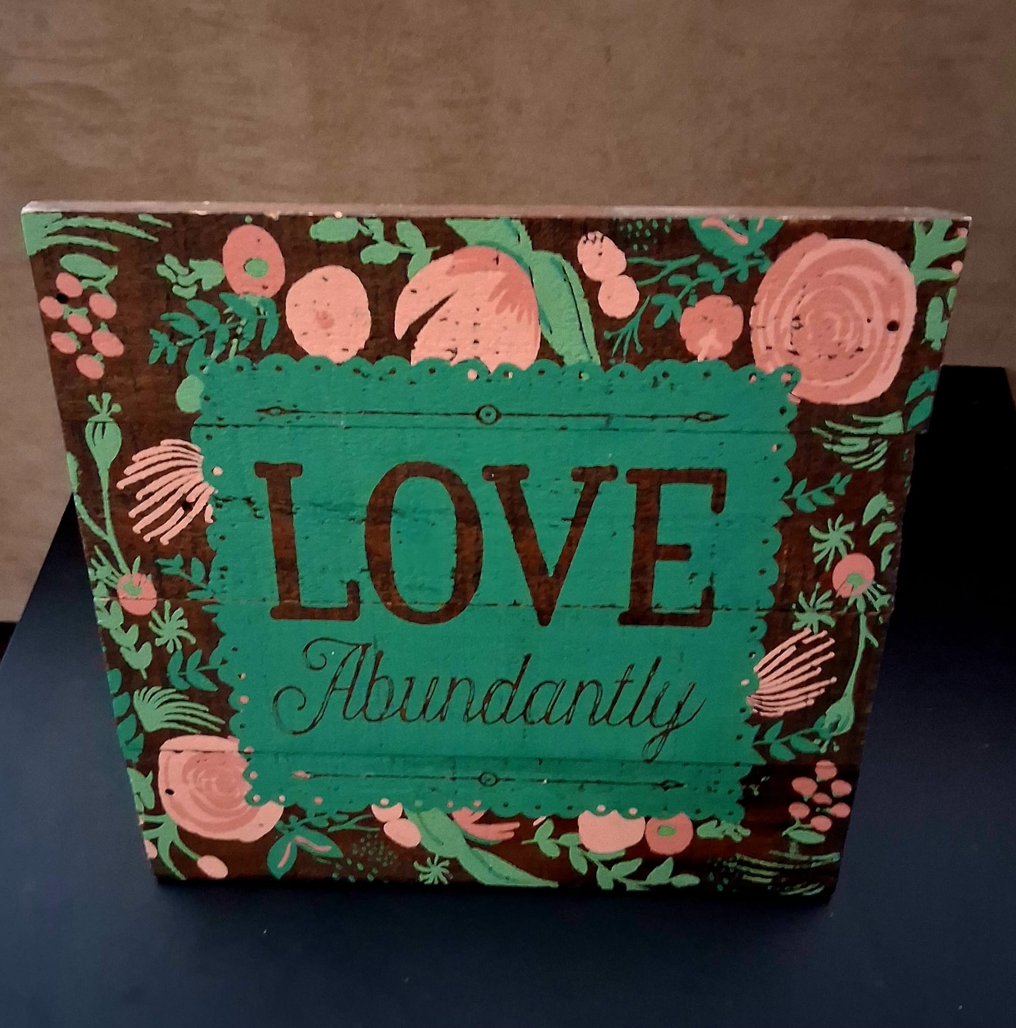 🌿 Rustic “Love Abundantly” Wooden Sign – Wall Hanger or Table Stand 🌿
