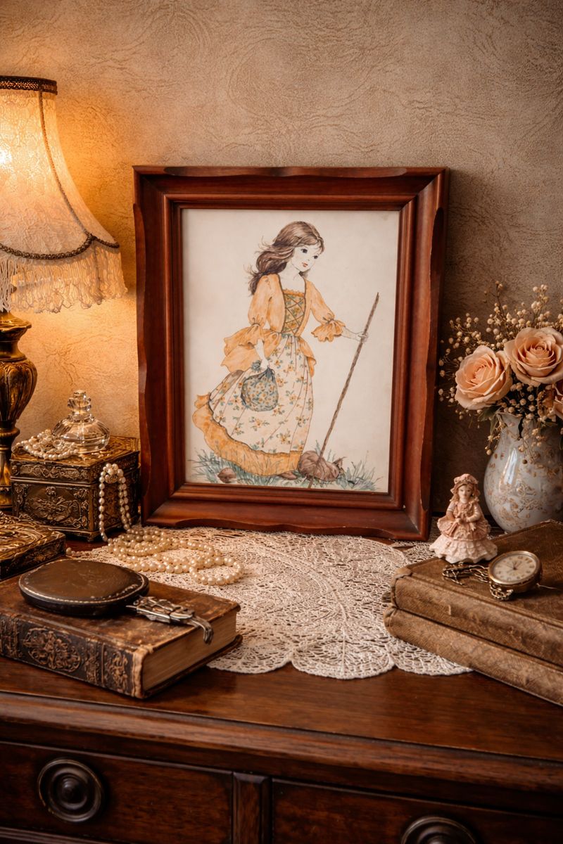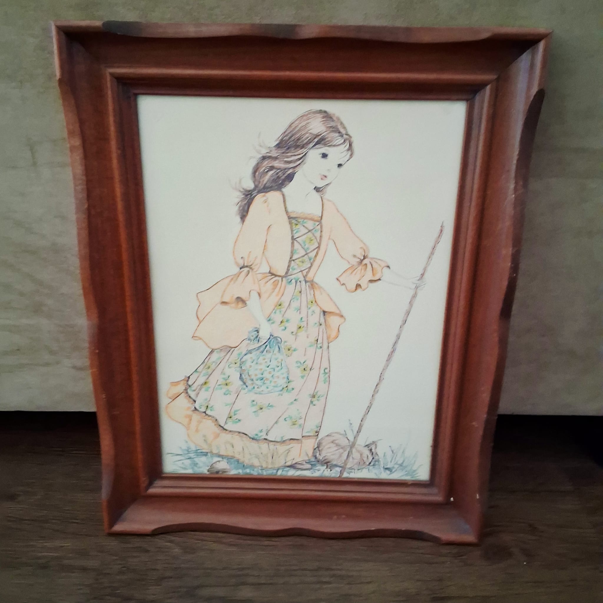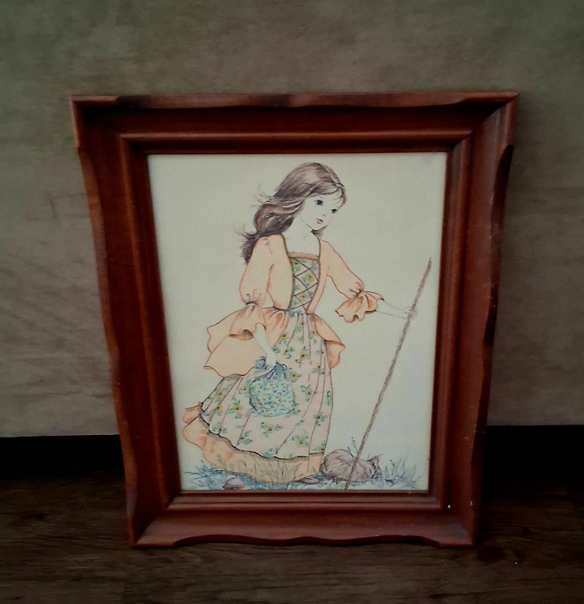 Bring a touch of nostalgic charm to your home with this vintage framed art print featuring a lovely young woman in a floral country dress and soft orange blouse, walking with a stick and holding a patterned bag. The artwork captures a gentle, pastoral scene that evokes warmth, simplicity, and timeless beauty.