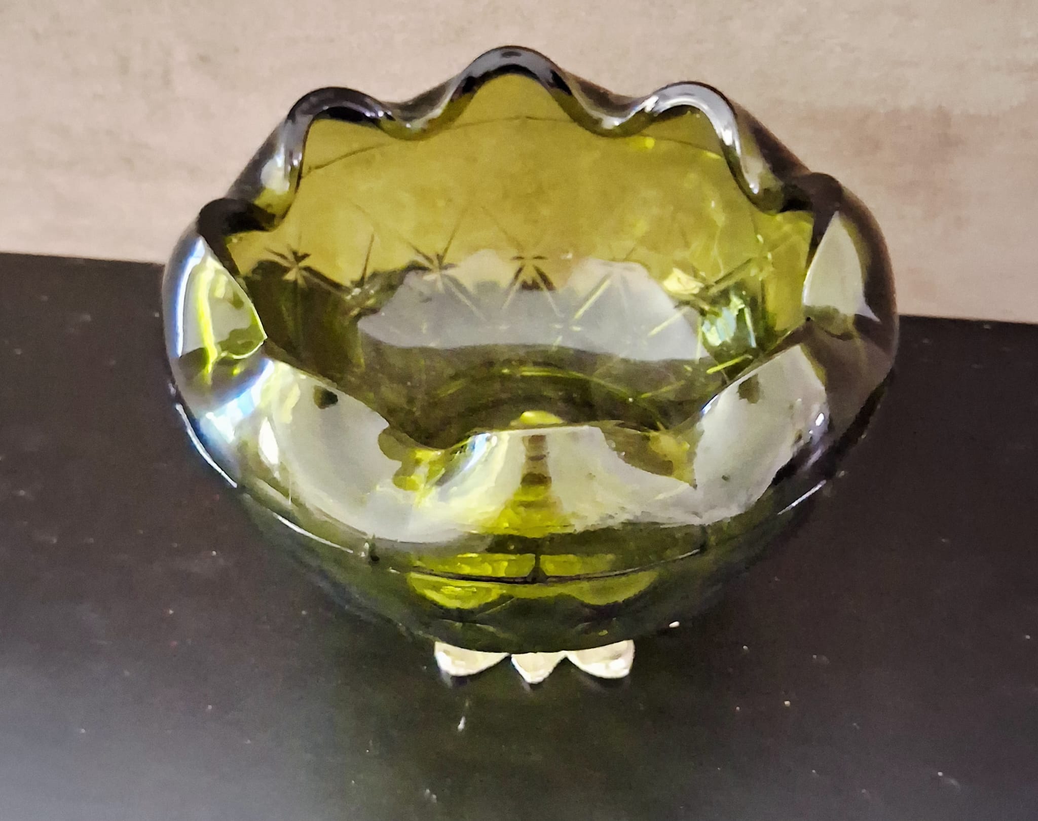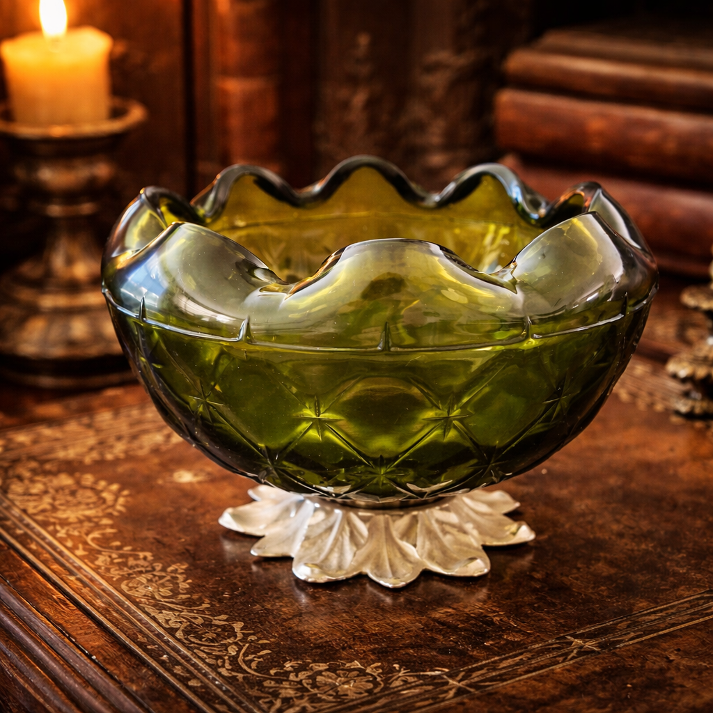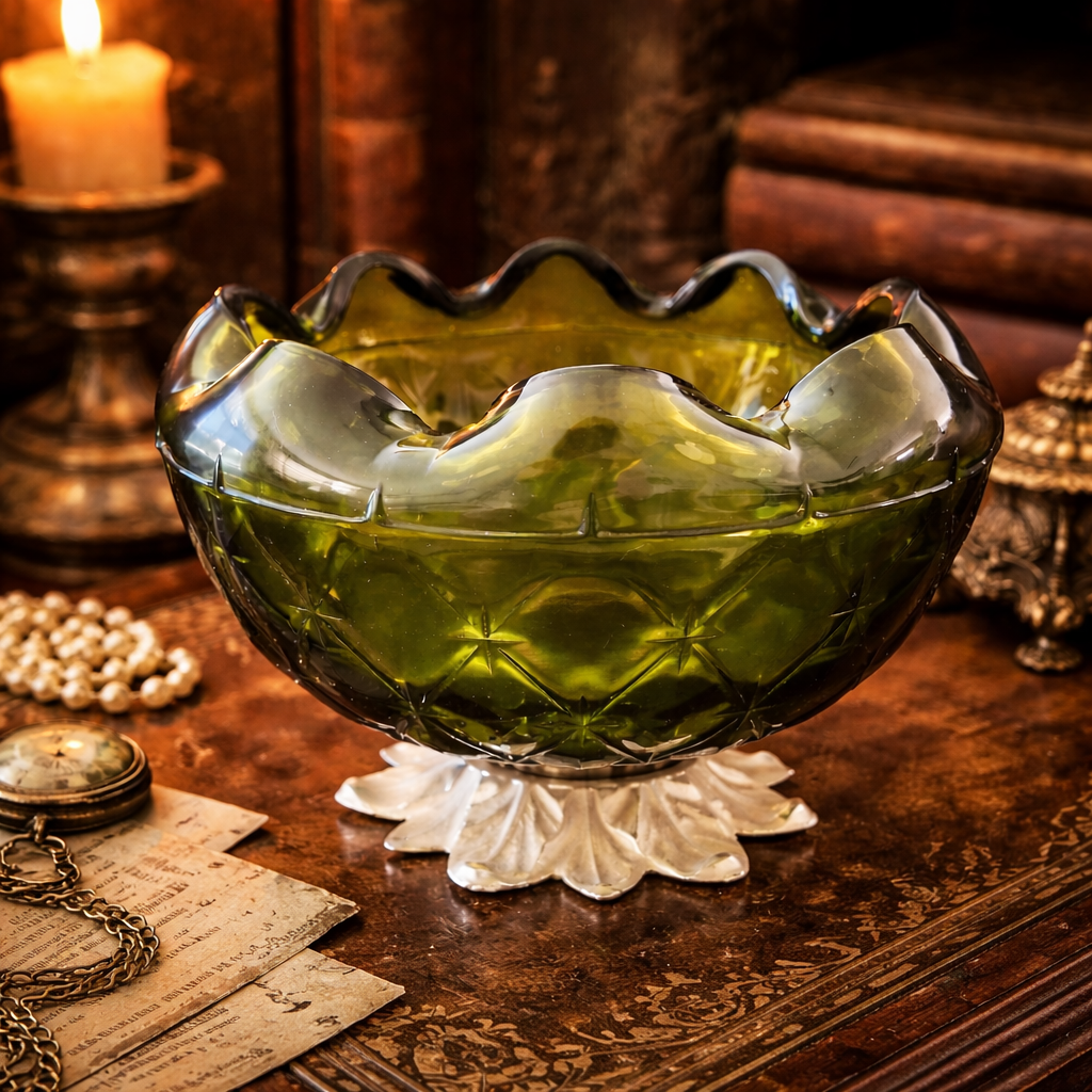 Add a touch of vintage charm to your home with this beautiful green glass compote bowl. The piece features a stunning diamond and star pattern design with a wavy scalloped edge, adding texture and sparkle from every angle. The rich olive green hue and elegant pedestal base make it perfect as a centerpiece, candy dish, or decorative accent for any room.